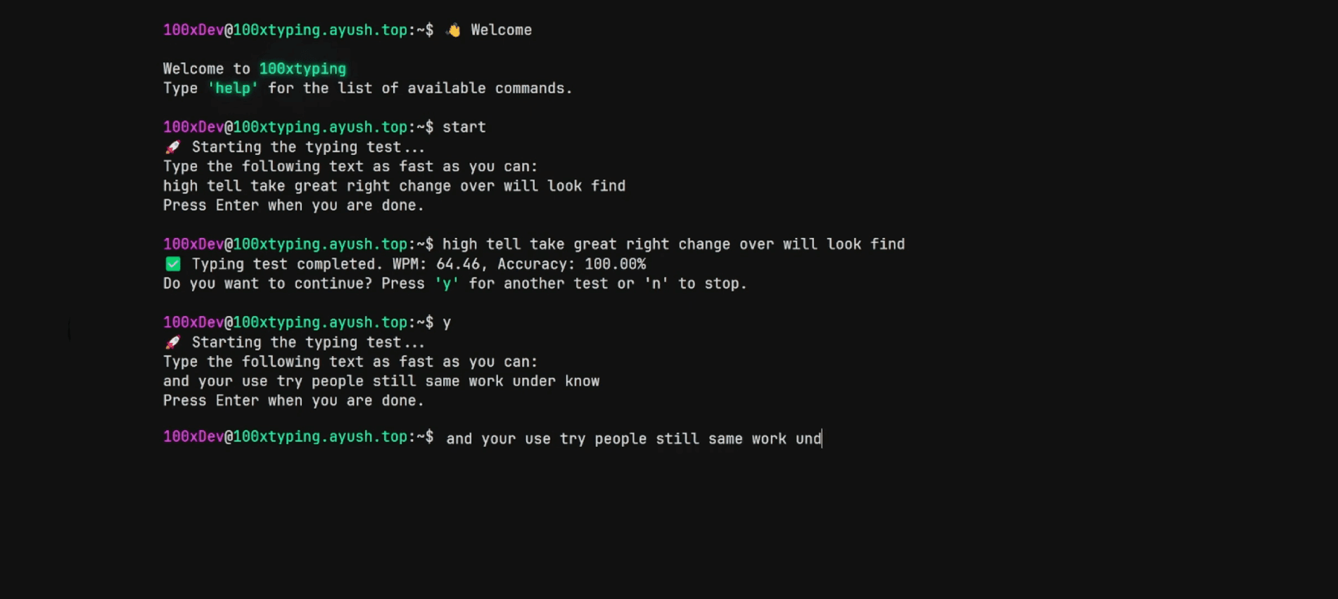 Minimal terminal themed Typing Test. Returns WPM and accuracy. Dark mode available.